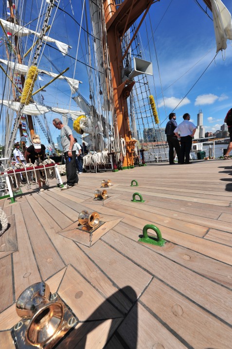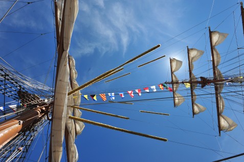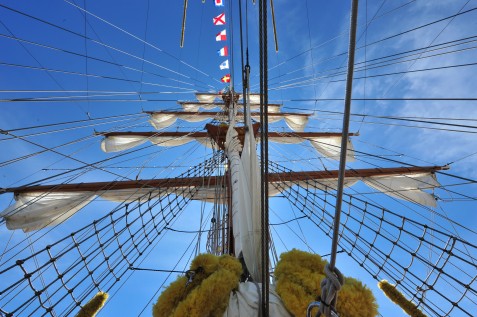 I was just ‘passing’ through the harbour on the 9th, the day the ships were about to leave. Just when we were there the “Libertad” (Argentina) was pulled outside the harbour. They let white and blue balloons fly, fired the cannons, while the sailors where up in the mast to set the sails. I managed to take this photo from behind glass. Immediately I wanted to stay and watch the others leave, but they were taking their time. This is all I got to see. I was hoping to see this one set his sails, but as for as we could see they didn’t. Yes the wind was coming from ahead, but I wouldn’t think that these vessels would prefer to on engine because of the wind….